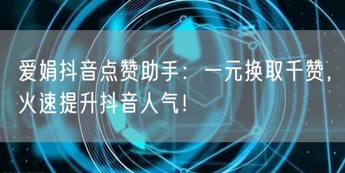 摘要:在当今社交媒体盛行的时代,抖音已成为众多网友展示自我、追求人气的重要平台。然而,如何快速增加抖音人气,让作品在众多内容中脱颖而出,成为每个用户都关注的问题。这时,爱娟抖音点赞助手应运而生,以一元换取千赞的优惠方式,助力你火速提升抖音人气!